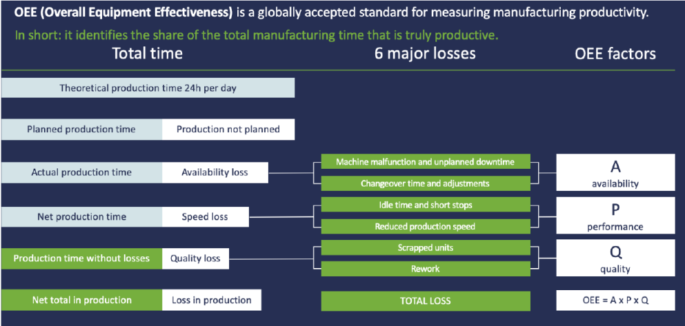 OEE (Overall Equipment Effectiveness) is a “best practices” metric that identifies the percentage of planned production time that is truly productive. An OEE score of 100% represents perfect production: manufacturing only good parts, as fast as possible, with no downtime.